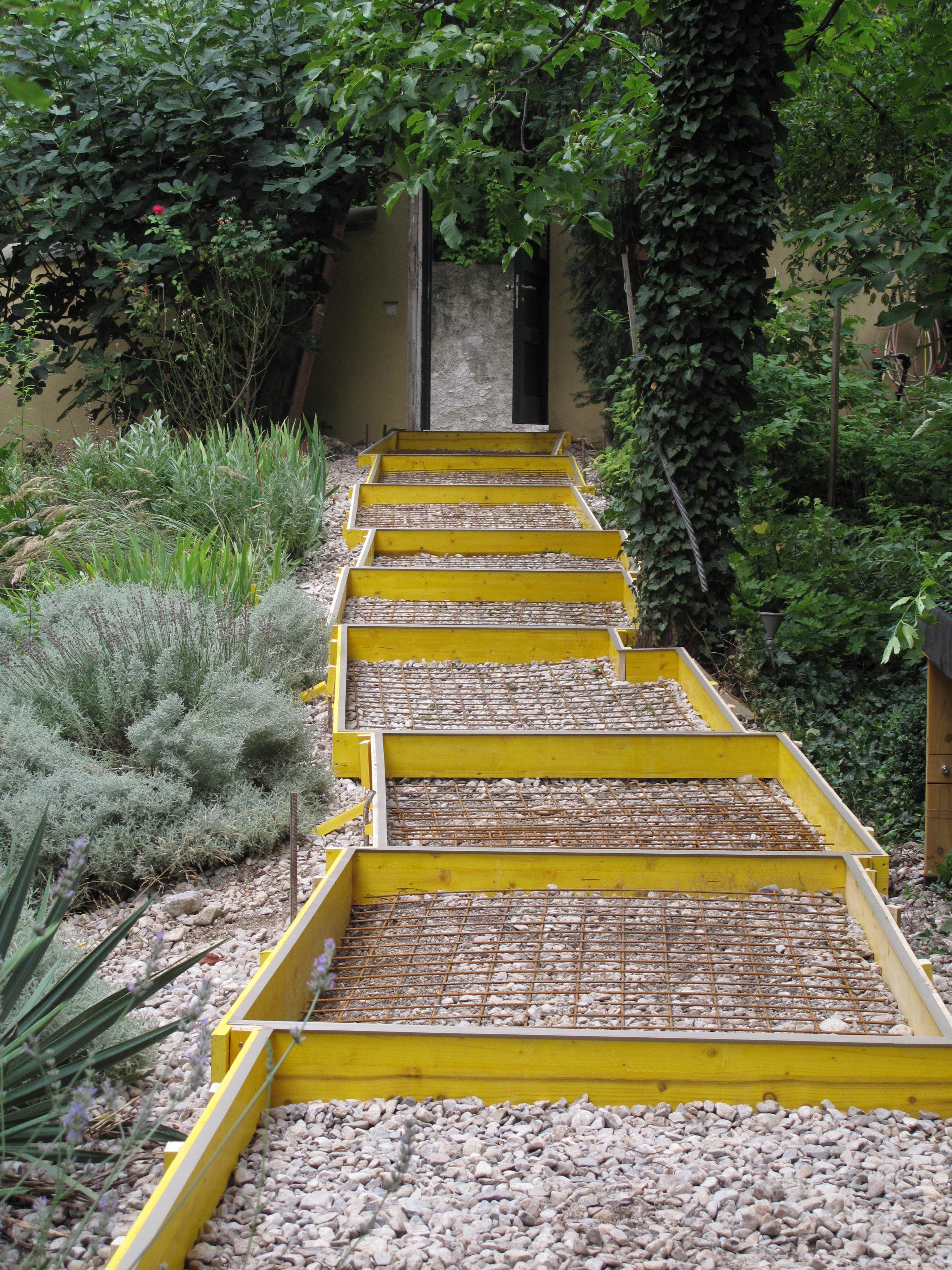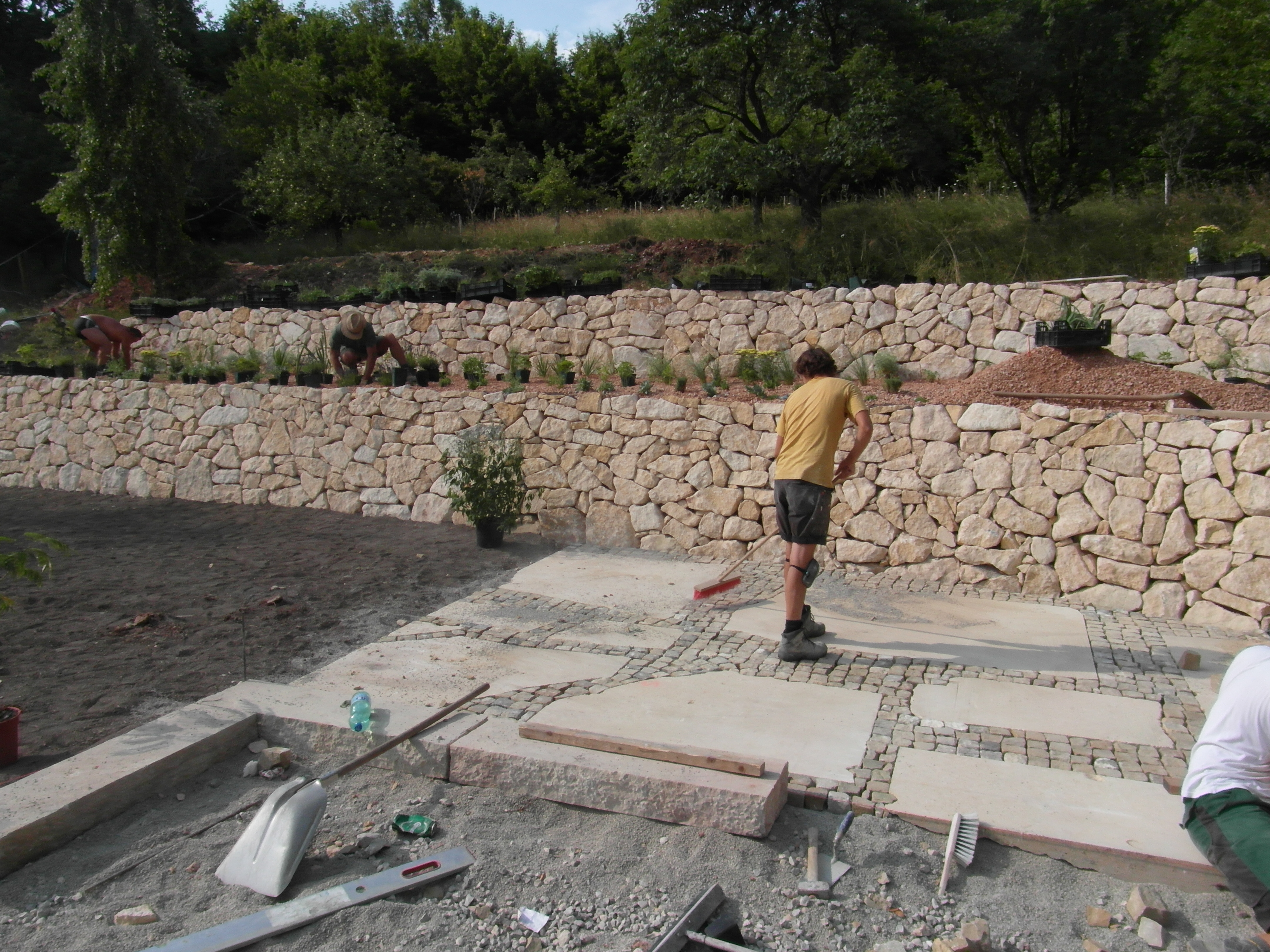 Ein schöner Platz, hoch über der Straße, schon fast im Wald und in den Felsen. Das sollte nicht verloren gehen. An zwei Seiten des Pools haben wir die bruchrauhen, unrägelmäßigen Krustenplatten aus Magarethener Sandstein bearbeitet, bis sie aussahen, wie vom Meer abgeschliffen, das vor langer Zeit genau hier seine Küste hatte.